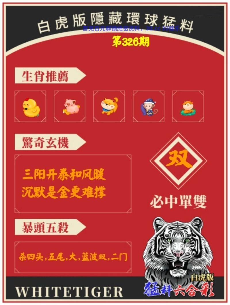 326期:白虎环球猛料 开:猪19对 三阳开泰和风暖,沉默是金更难撑 解释:三阳开泰和风暖,沉默是金更难撑,解虎马鼠猴 九肖:虎马鼠猴羊狗猪龙牛 |